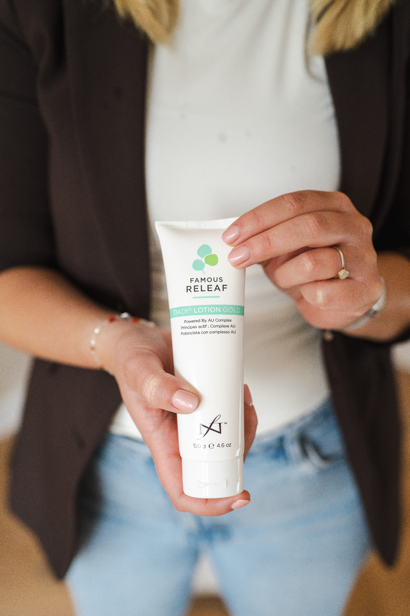Famous Releaf Dadi’ Lotion Gold is een snel intrekkende hand-, voet- en bodylotion die je huid direct zacht en soepel maakt. Dankzij het AU Complex (allantoïne + ureum) wordt zelfs droge of ruwe huid snel gladder. De lotion bevat dezelfde natuurlijke oliën als Dadi’Oil en ruikt heerlijk fris.