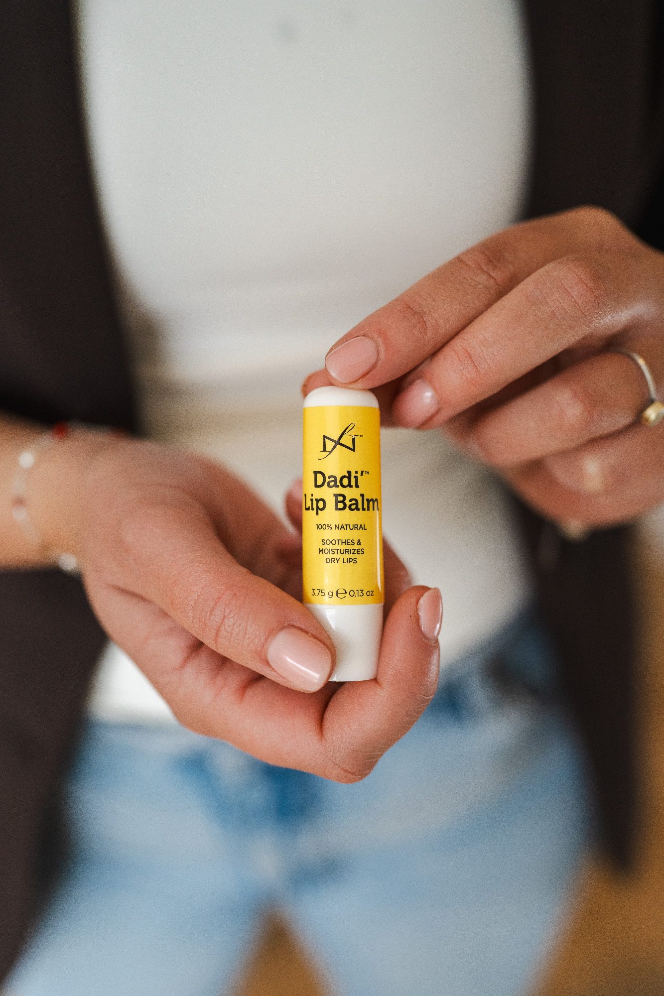 Dadi’ Lip Balm verzorgt en hydrateert droge, schrale lippen direct. De natuurlijke oliën uit Dadi’Oil, samen met bijenwas, cacaoboter, kokosolie, aloë vera en vitamine E, verzachten en beschermen de lippen.